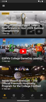 College Football Playoff هو التنسيق الحاسم لبطولة كرة القدم الجامعية الوطنية FBS. يبرز هذا النظام أهمية كل مباراة في موسم مثير. مع CFBPlayoff، التطبيق الرسمي، يمكنك متابعة كل الإثارة واللحظات الكبرى لهذا الحدث الرياضي الفريد.